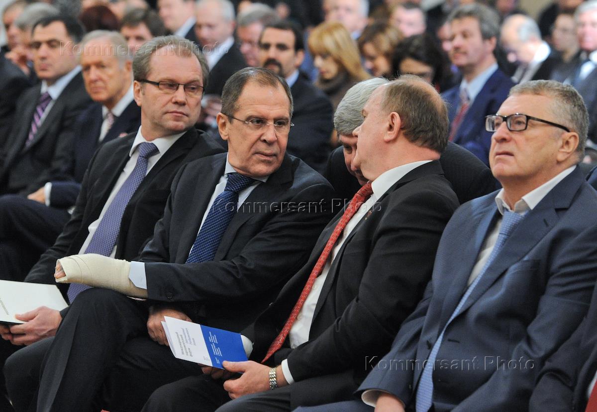 Слева направо: полномочный представитель Президента России в Государственной Думе России Гарри Минх, министр иностранных дел России Сергей Лавров, лидер Коммунистической партии России (КПРФ), депутат Государственной думы (ГД) России Геннадий Зюганов и лидер Либерально-демократической партии России, депутата ГД России Владимир Жириновский во время I международного парламентского форума "Современный парламентаризм и будущее демократии". Форум прошел в императорском зале Московского государственного университета (МГУ) имени М.В.Ломоносова.