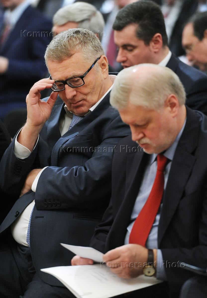 Лидер Либерально-демократической партии России, депутата Государственной думы (ГД) России Владимир Жириновский (слева) и лидер партии "Справедливая Россия", депутат ГД Сергей Миронов (справа) во время I международного парламентского форума "Современный парламентаризм и будущее демократии". Форум прошел в императорском зале Московского государственного университета (МГУ) имени М.В.Ломоносова.