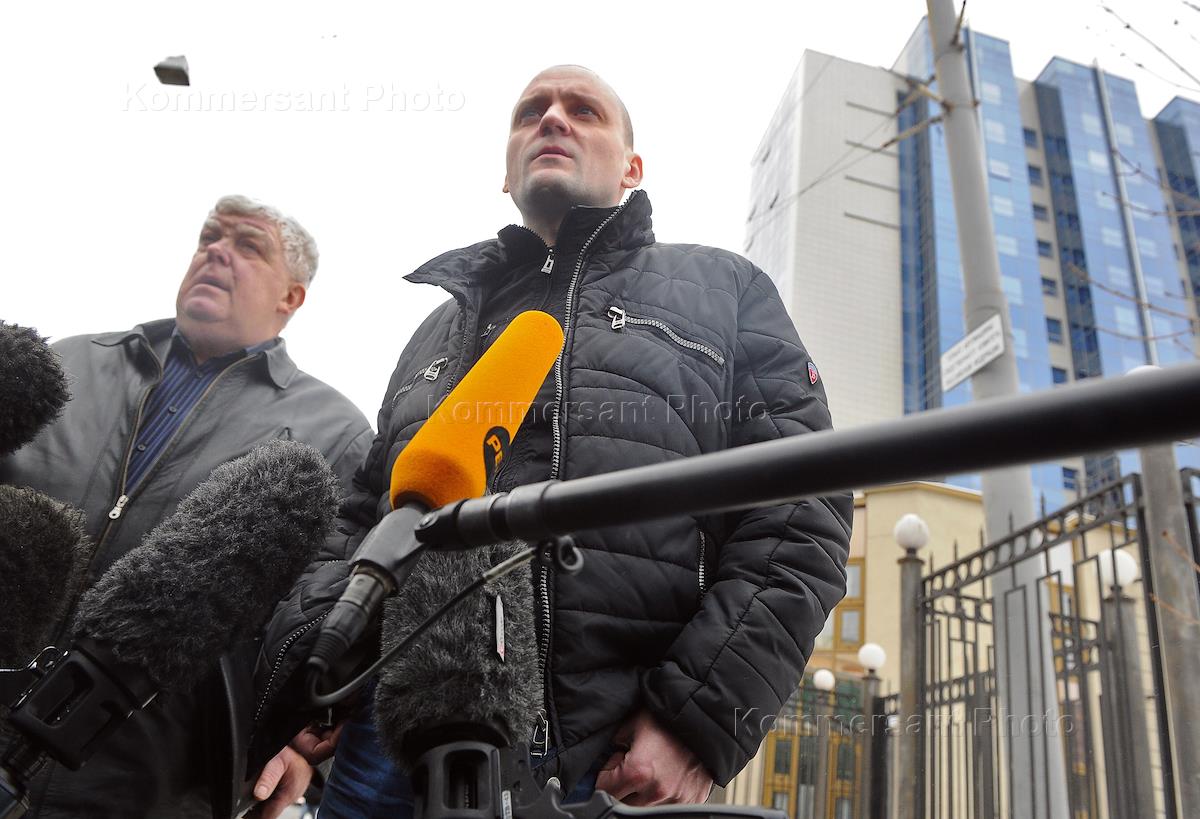 Лидер движения "Левый фронт" Сергей Удальцов (справа) у здания Следственного комитета (СК) России, куда он был вызван на допрос по делу о подготовке массовых беспорядков.