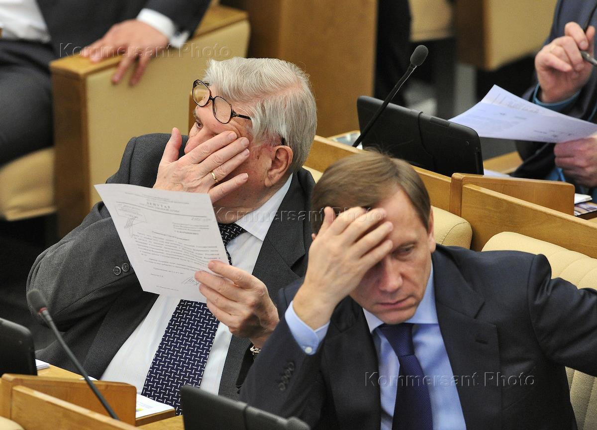 Председатель комитета Государственной думы (ГД) России по конституционному законодательству и государственному строительству Владимир Плигин (слева) и член комитета ГД по безопасности и противодействию коррупции Владимир Васильев (справа) на заседании Госдумы.