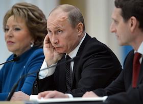 Слева направо: председатель Совета Федерации России Валентина Матвиенко, президент России Владимир Путин и председатель Государственной думы России Сергей Нарышкин на заседании совета законодателей России при Федеральном собрании России "О задачах законодательных (представительных) органов государственной власти по достижению стратегических целей социально-экономического развития РФ". Заседание прошло в Кремле.