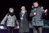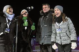 Церемония открытия благотворительного проекта – "Ярмарка Добрых Дел от Сбербанка". Слева направо: актриса Чулпан Хаматова, актриса Дина Корзун, президент "Сбербанка России" Герман Греф на площади Поклонной горы.