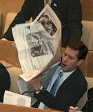 Член депутатской группы "Регионы России" (Союз независимых депутатов), председатель Комитета Государственной Думы по бюджету и налогам Александр Жуков читает газету "КоммерсантЪ" в перерыве думского заседания.