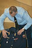 Заместитель председателя Комитета Государственной Думы России по обороне Николай Безбородов поправляет свой военный китель на стуле во время перерыва думского заседания.