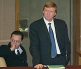 Председатель правления РАО "ЕЭС России" Анатолий Чубайс (слева) и полномочный представитель Президента России в Государственной Думе Александр Котенков (справа) на очередном заседании Государственной Думы.