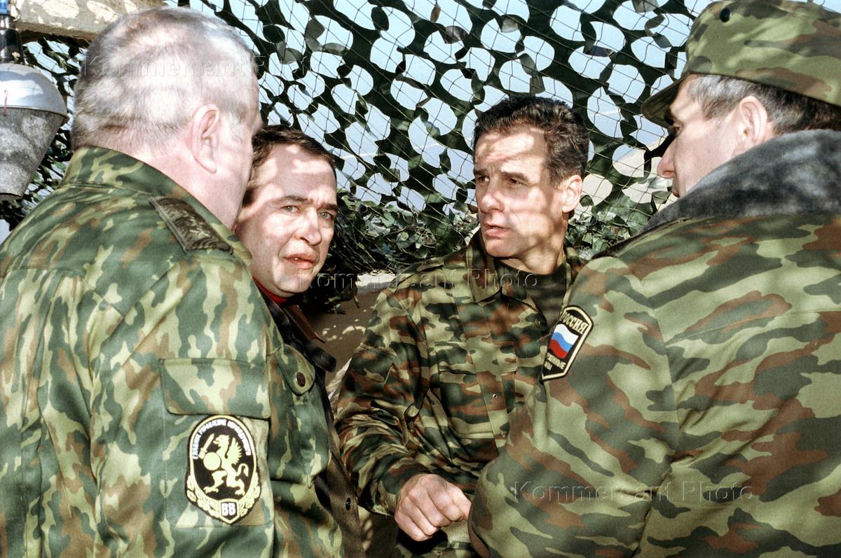 Слева направо: министр внутренних дел России Владимир Рушайло, начальник Генерального штаба Вооруженных сил России Анатолий Квашнин, командующий войсками Северо-Кавказского военного округа Виктор Казанцев и помощник Президента России по Чечне Сергей Ястржембский после обсуждения итогов войсковой операции по взятию федеральными войсками Грозного.