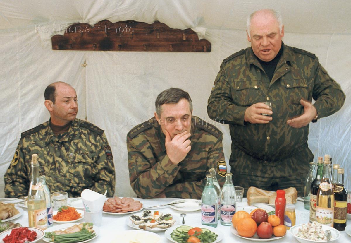 In the first row from left to right: Russian Interior Minister Vladimir Rushailo, Russian Chief of General Staff, General Anatoly Kvashnin, General Viktor Kazantsev, the Commander of Russian Forces in the North Caucasus; in the second row: Sergei Yastrzhebsky, President Putin's aide on Chechen affaires (center) have a lunch after the discusssion of the results of Grozny seizure.