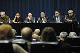 Председатель Совета при президенте России по развитию гражданского общества и правам человека Михаил Федотов (в центре) и советник Генерального директора ЮНЕСКО Генрих Юшкявичус (третий справа) во время заседания "круглого стола" по проблеме общественного ТВ, организованного международным клубом Союза журналистов России. Заседание прошло в ЦДЖ.