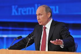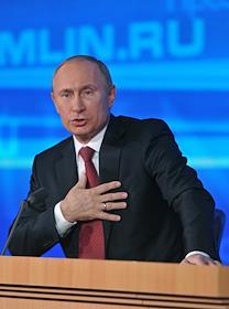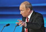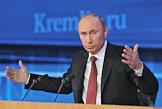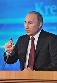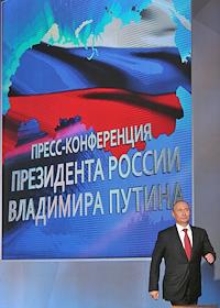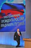 Президент России Владимир Путин во время проведения пресс-конференции для журналистов в Центре международной торговли.