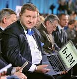 Международный обозреватель радиостанции "КоммерсантЪ-FM" Константин Эггерт на пресс-конференции президента России Владимира Путина для журналистов в Центре международной торговли.
