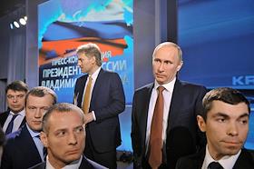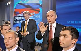 Президент России Владимир Путин (второй справа) и заместитель руководителя администрации президента России, пресс-секретарь президента Дмитрий Песков (третий справа) во время проведения пресс-конференции для журналистов в Центре международной торговли.