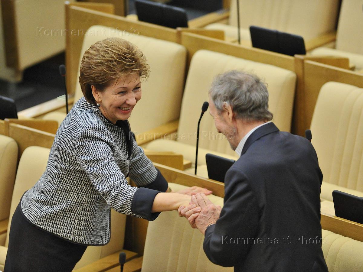 Первый заместитель председателя комитета Государственной думы (ГД) России по природным ресурсам, природопользованию и экологии Анатолий Карпов (слева) и член комитета ГД России по международным делам Валентина Терешкова (справа) на пленарном заседании Госдумы.