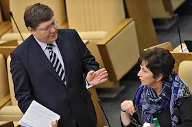 Заместитель председателя комитета Государственной думы (ГД) России по гражданскому, уголовному, арбитражному и процессуальному законодательству Александр Ремезков (слева) и первый заместитель председателя комитета ГД России по бюджету и налогам Глеб Хор (справа) во время пленарного думского заседания.