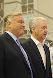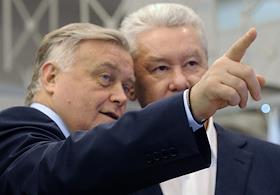 Президент ОАО "Российские железные дороги" (РЖД) Владимир Якунин (слева) и мэр Москвы Сергей Собянин (справа) перед началом церемонии подписания соглашения о совместных инвестициях в развитие инфраструктуры пригородных пассажирских перевозок на Московском железнодорожном узле в 2012-2020гг. Встреча прошла на Рижском вокзале.