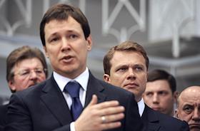 Президент ОАО "Российские железные дороги" (РЖД) Владимир Якунин (слева) и мэр Москвы Сергей Собянин (справа) во время церемонии подписания соглашения о совместных инвестициях в развитие инфраструктуры пригородных пассажирских перевозок на Московском железнодорожном узле в 2012-2020гг. Встреча прошла на Рижском вокзале.