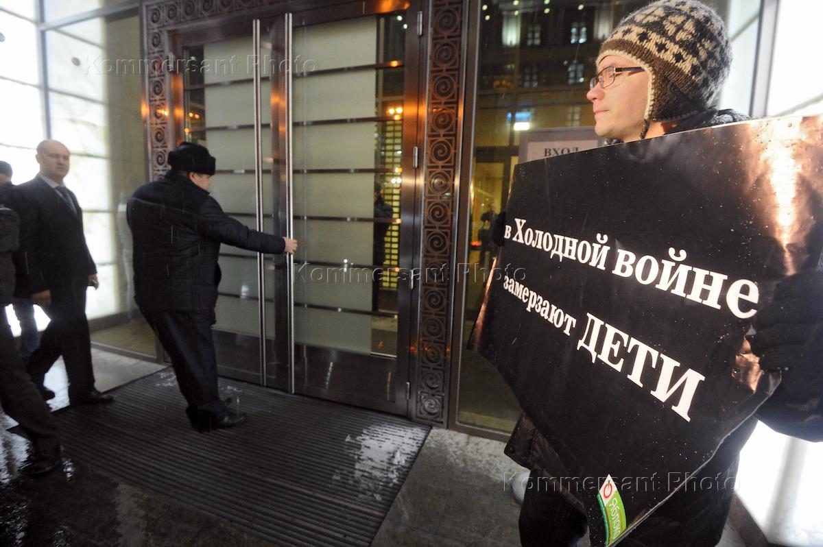 Участник серии одиночных пикетов активистов партии "Яблоко" против принятия "закона Димы Яковлева" под лозунгом "Сенаторы, боритесь с коррупцией, а не с сиротами!". Плакат с надписью "В холодной войне замерзают дети!". Пикет прошел у здания Совета Федерации России.
