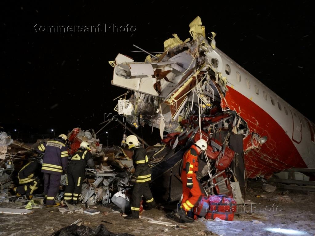 Спасатели МЧС России на месте крушения самолета Ту-204 авиакомпании Red Wings в аэропорту "Внуково". Самолет после жесткой посадки выехал за пределы взлетно-посадочной полосы на проезжую часть Киевского шоссе, загорелся и развалился на части. Эвакуация пассажиров.