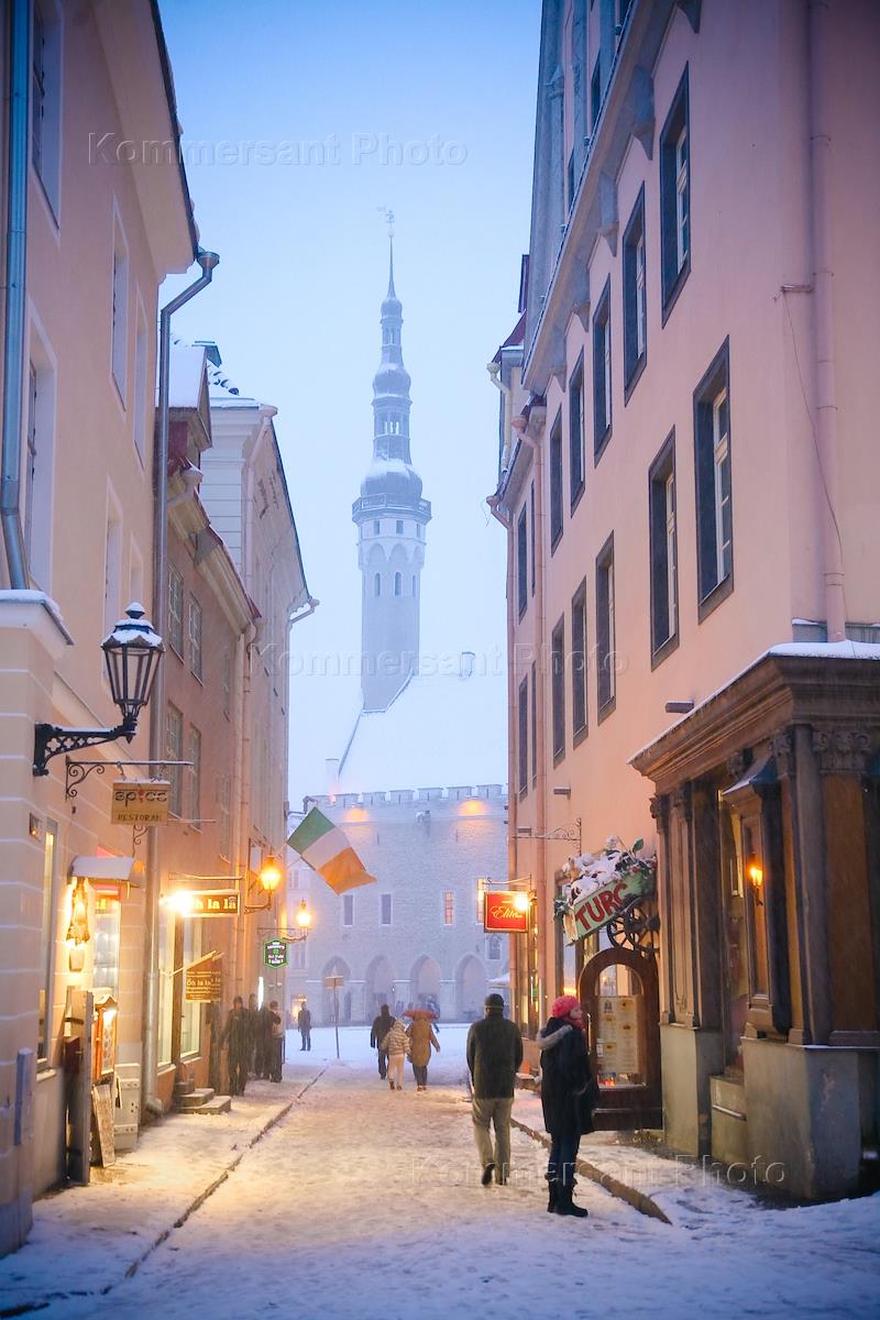 Виды Таллина. Государственный флаг Эстонии на башне замка.