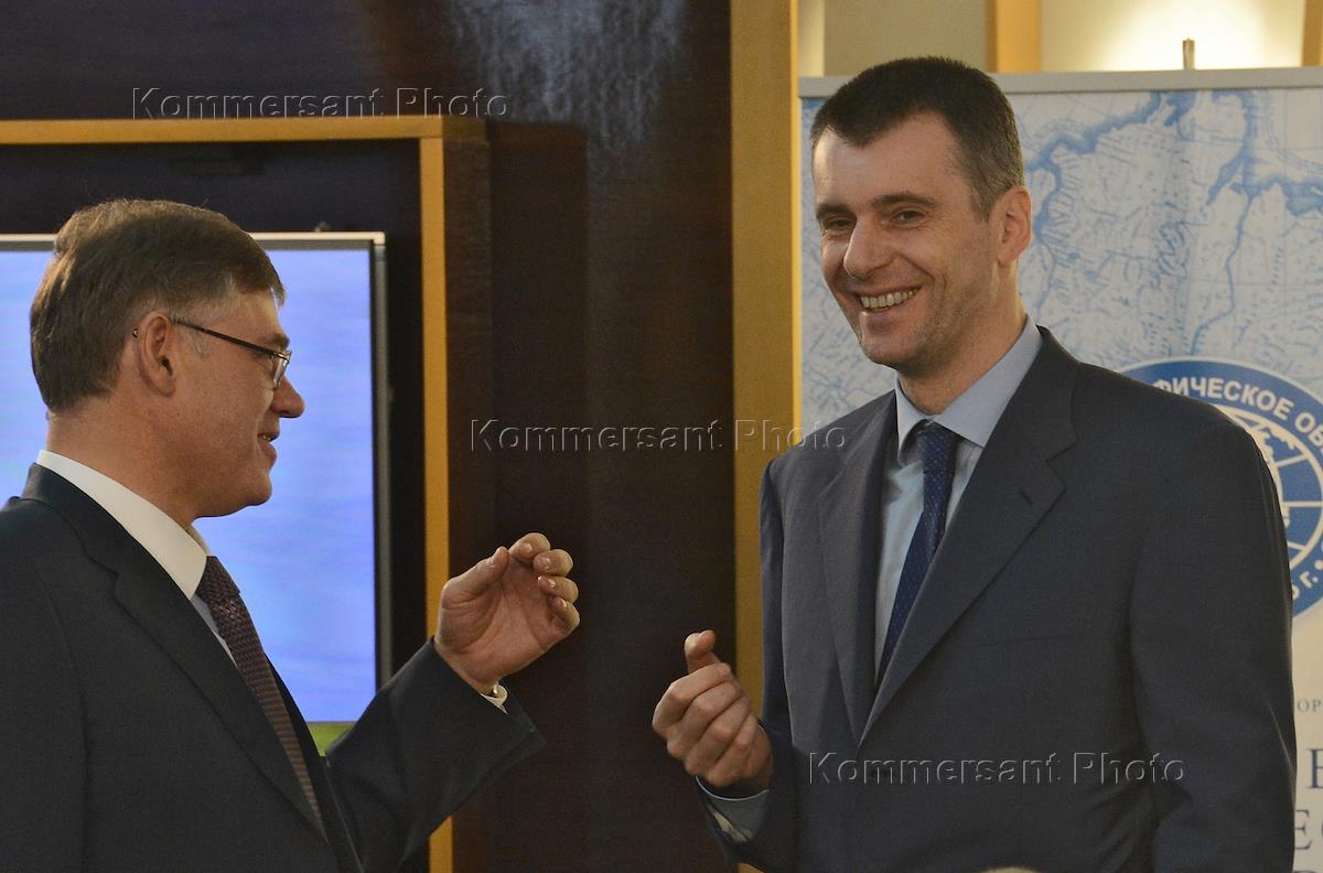 Chairman of the Board Directors "Evraz Plc" Alexander Abramov (left) and President of the "Onexim" Mikhail Prokhorov (right) at the opening of the headquarters Russian Geographical Society (RGS).