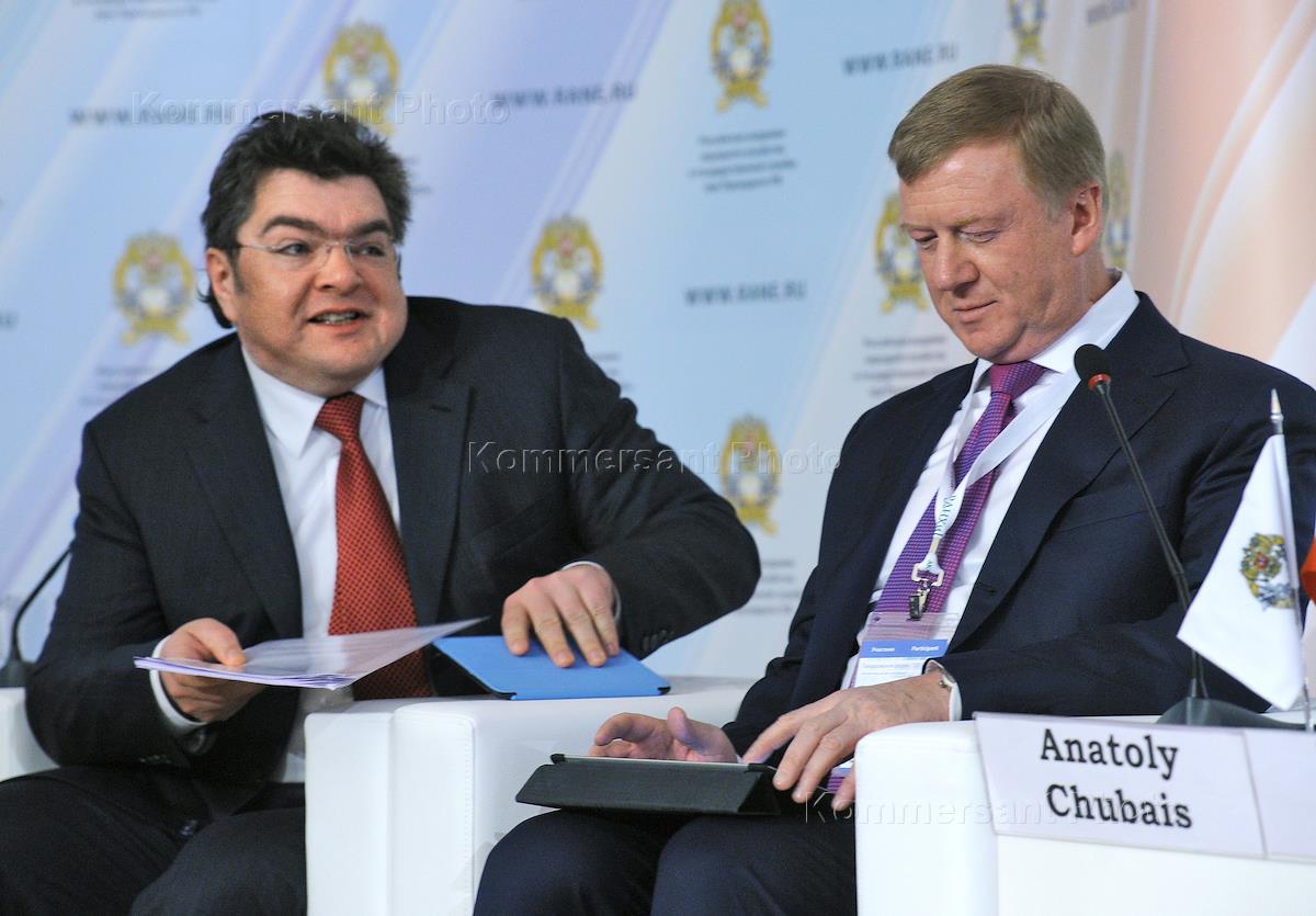 Гайдаровский форум 2013. Генеральный директор Роснано Анатолий Чубайс (слева) и министр России по связям с Открытым правительством Михаил Абызов (справа) во время заседания "Россия и мир: вызовы интеграции". Заседание прошло в Российской академии народного хозяйства и государственной службы при президенте России.