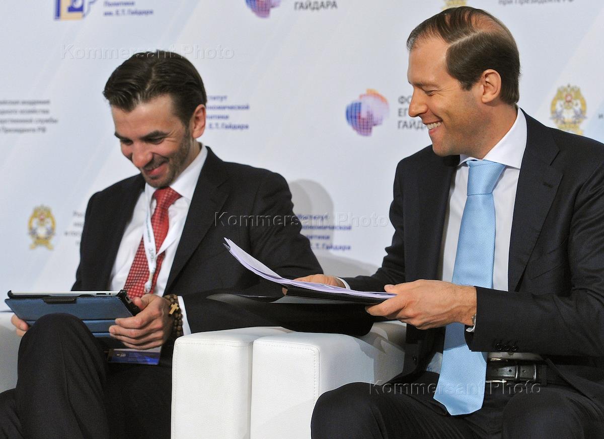 Гайдаровский форум 2013. Министр России по связям с Открытым правительством Михаил Абызов (слева) и министр промышленности и торговли России Денис Мантуров (справа) во время заседания "Россия и мир: вызовы интеграции". Заседание прошло в Российской академии народного хозяйства и государственной службы при президенте России.