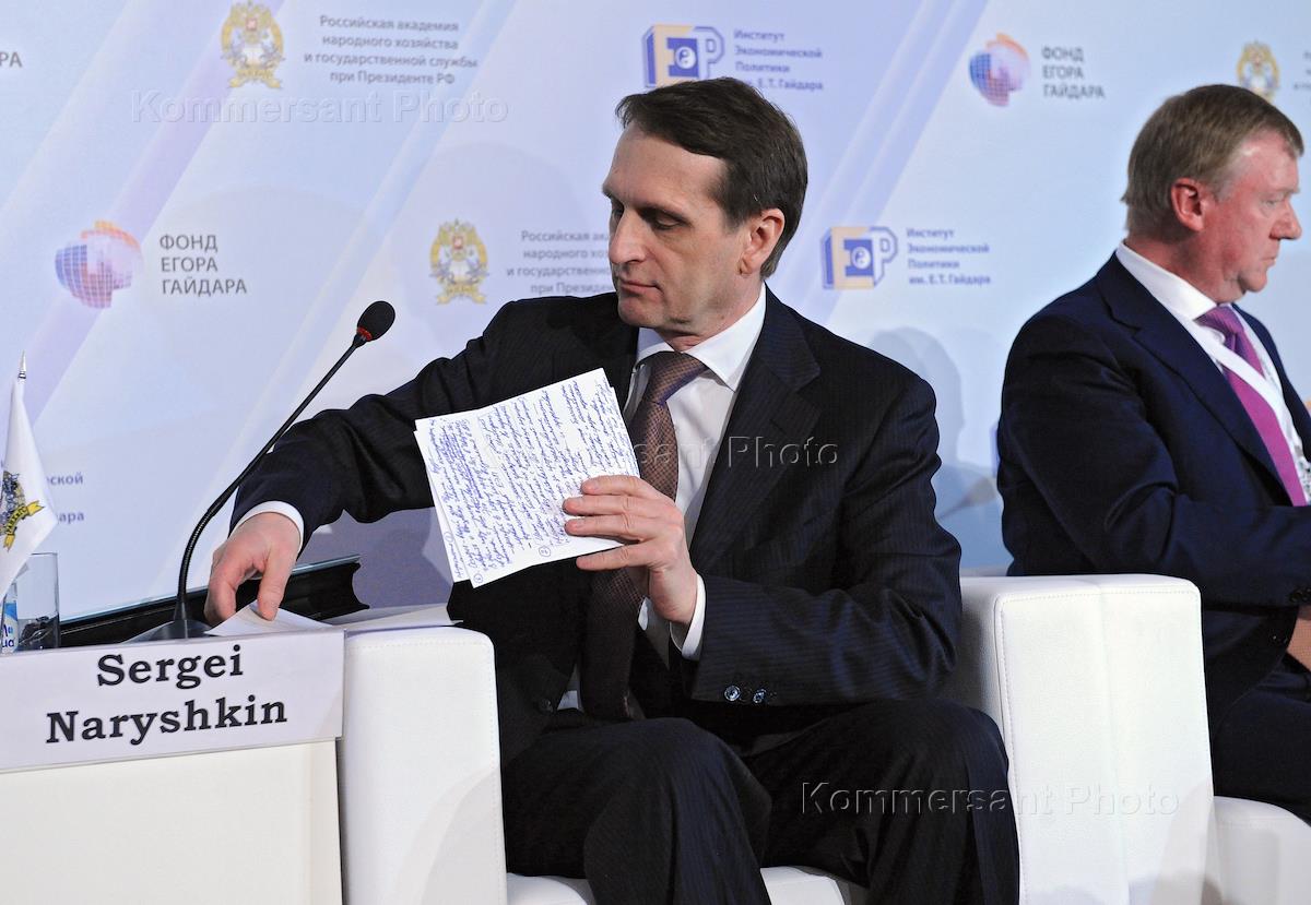 Гайдаровский форум 2013. Председатель Государственной думы России Сергей Нарышкин во время заседания "Россия и мир: вызовы интеграции". Заседание прошло в Российской академии народного хозяйства и государственной службы при президенте России.