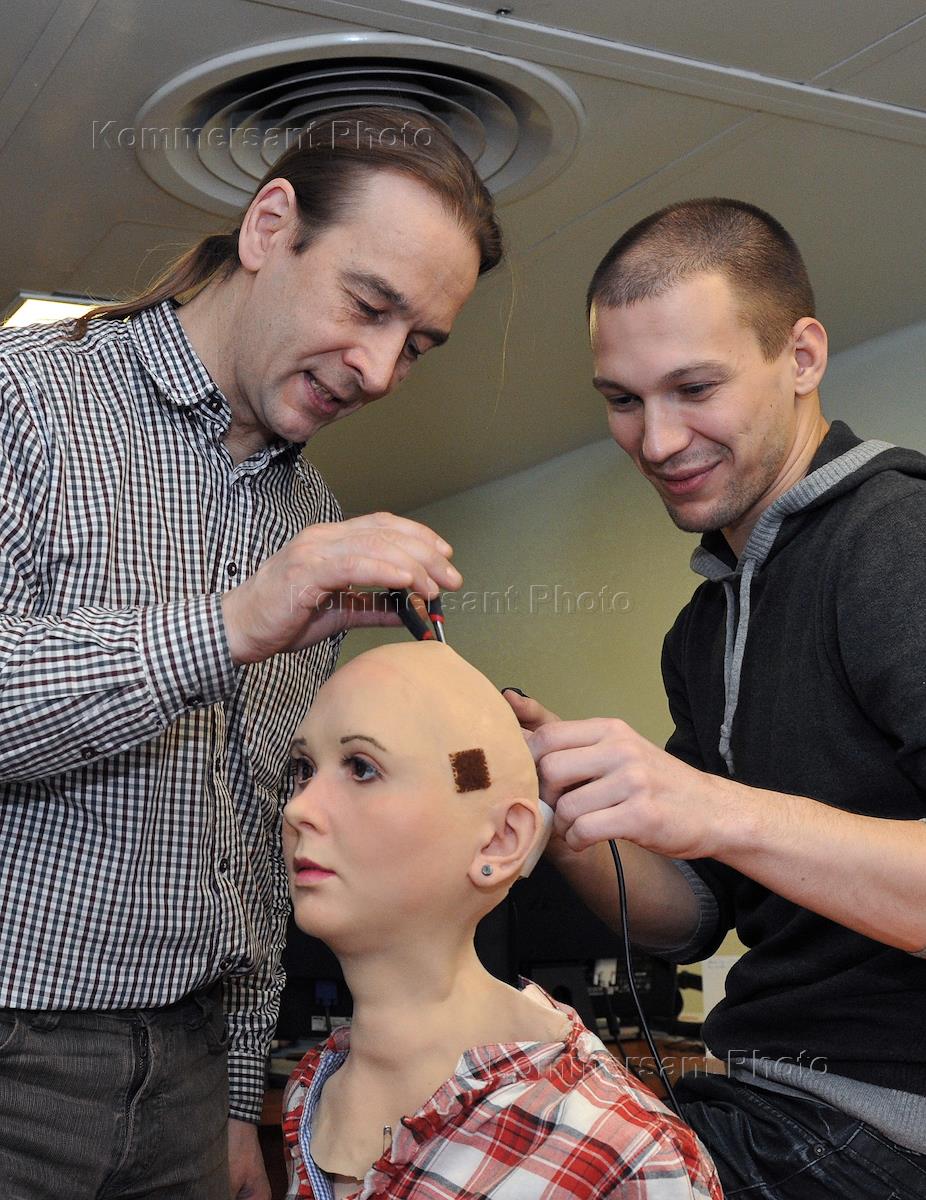 Директор компании Владимир Конышев (слева) и один из инженеров-робототехников компании "Нейроботикс" (справа) в процессе создания робота Алисы.