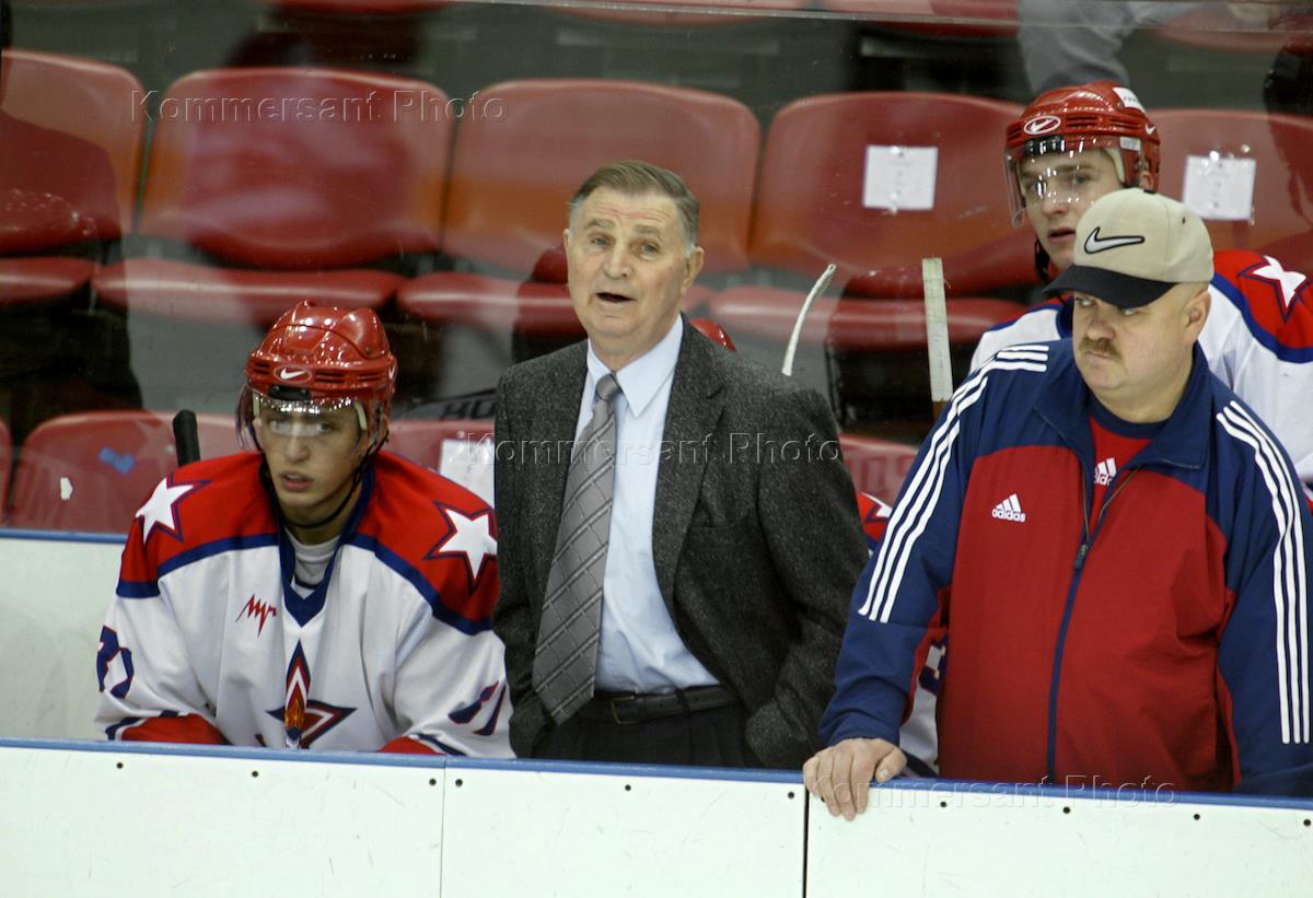 Hockey team "TSKA" coach Viktor Tikhonov (center) assists at the match "TSKA" - "Spartak".