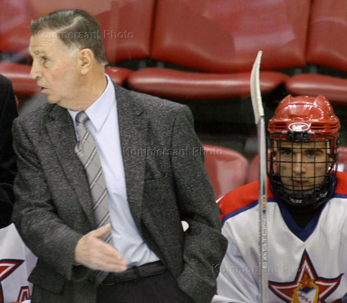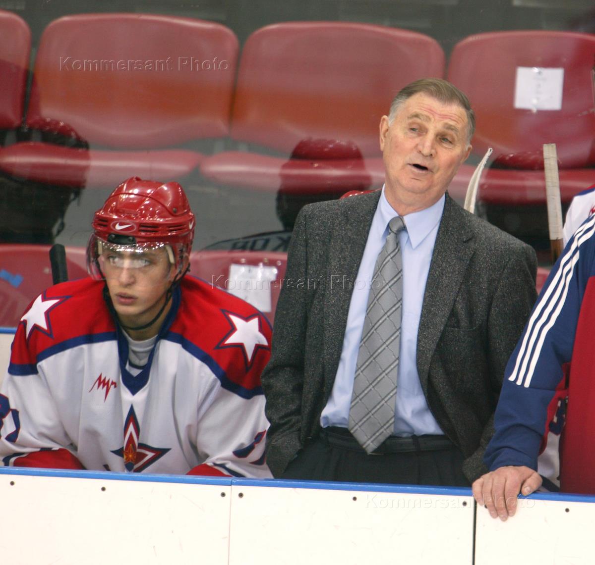 Тренер хоккейной команды "ЦСКА" Виктор Тихонов (слева) во время матча "ЦСКА" - "Спартак". Матч прошел в Ледовом дворце "ЦСКА".