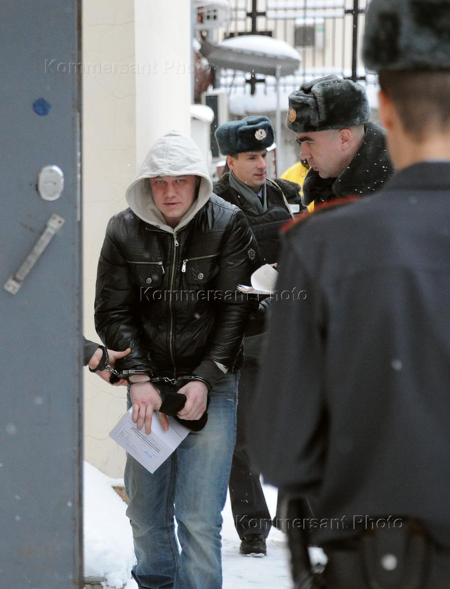 Виновник ДТП на Минской улице Александр Максимов (справа), в сентябре 2012 года сбивший насмерть семь человек на автобусной остановке, перед заседанием Тверского районного суда.