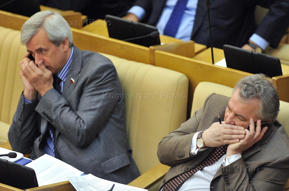Член комитета Государственной думы (ГД) России по безопасности и противодействию коррупции Владимир Васильев (слева) и член комитета ГД по бюджету и налогам Николай Гончар (справа) во время пленарного заседания Госдумы России.