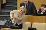 Председатель комитета Государственной думы (ГД) России по вопросам семьи, женщин и детей Елена Мизулина (слева) и председатель кмитета ГД России по конституционному законодательству и государственному строительству Владимир Плигин (справа) на пленарном заседании Госдумы.