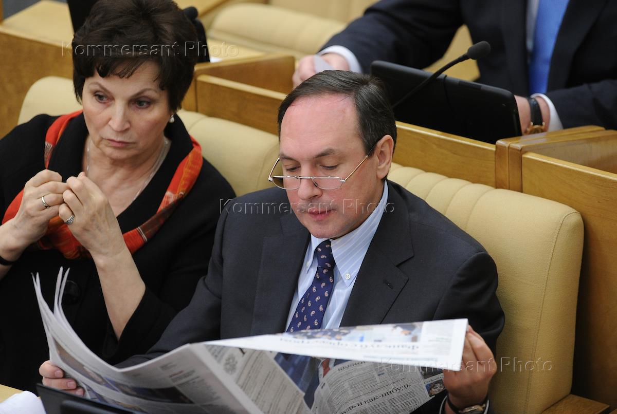 Первый заместитель председателя комитета Государственной думы России по науке и наукоемким технологиям Владимир Кононов (слева) и член комитета ГД по безопасности и противодействию коррупции Николай Макаров (справа) на пленарном заседании Госдумы.