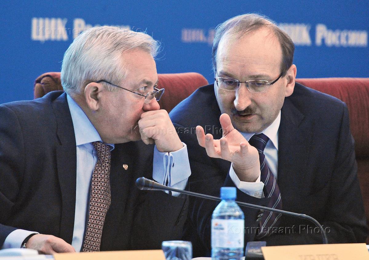 Заместитель председателя Центральной избирательной комиссии (ЦИК) России Леонид Ивлев (в центре) и секретарь ЦИК России Николай Конкин (справа) во время совещания ЦИК России с председателями избирательных комиссий субъектов России. Совещение прошло в ЦИК России.