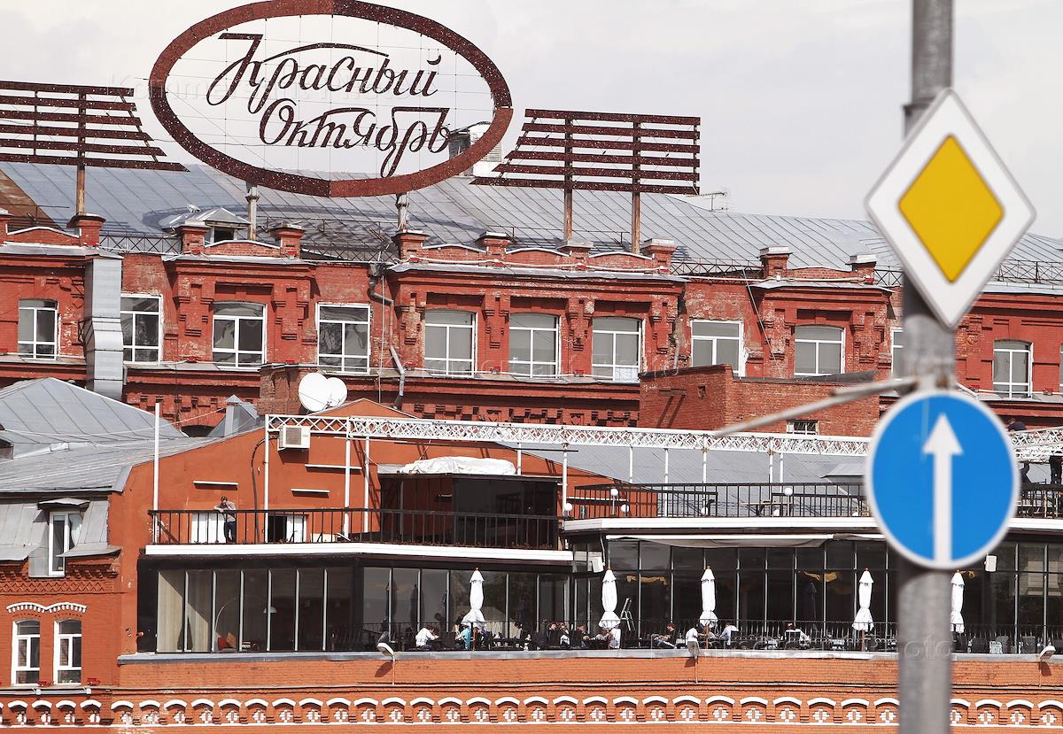 Вывеска Московской кондитерской фабрики "Красный Октябрь" на крыше здания.