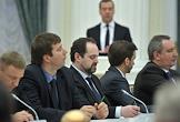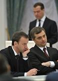 Расширенное заседание правительства России в Кремле. Слева направо: заместители председателя правительства России Аркадий Дворкович, Владислав Сурков и председатель правительства России Дмитрий Медведев во время заседания.