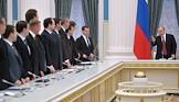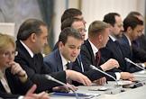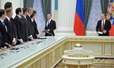 Председатель правительства России Дмитрий Медведев (в центре) и президент России Владимир Путин (справа) во время расширенного заседания правительства России в Кремле.