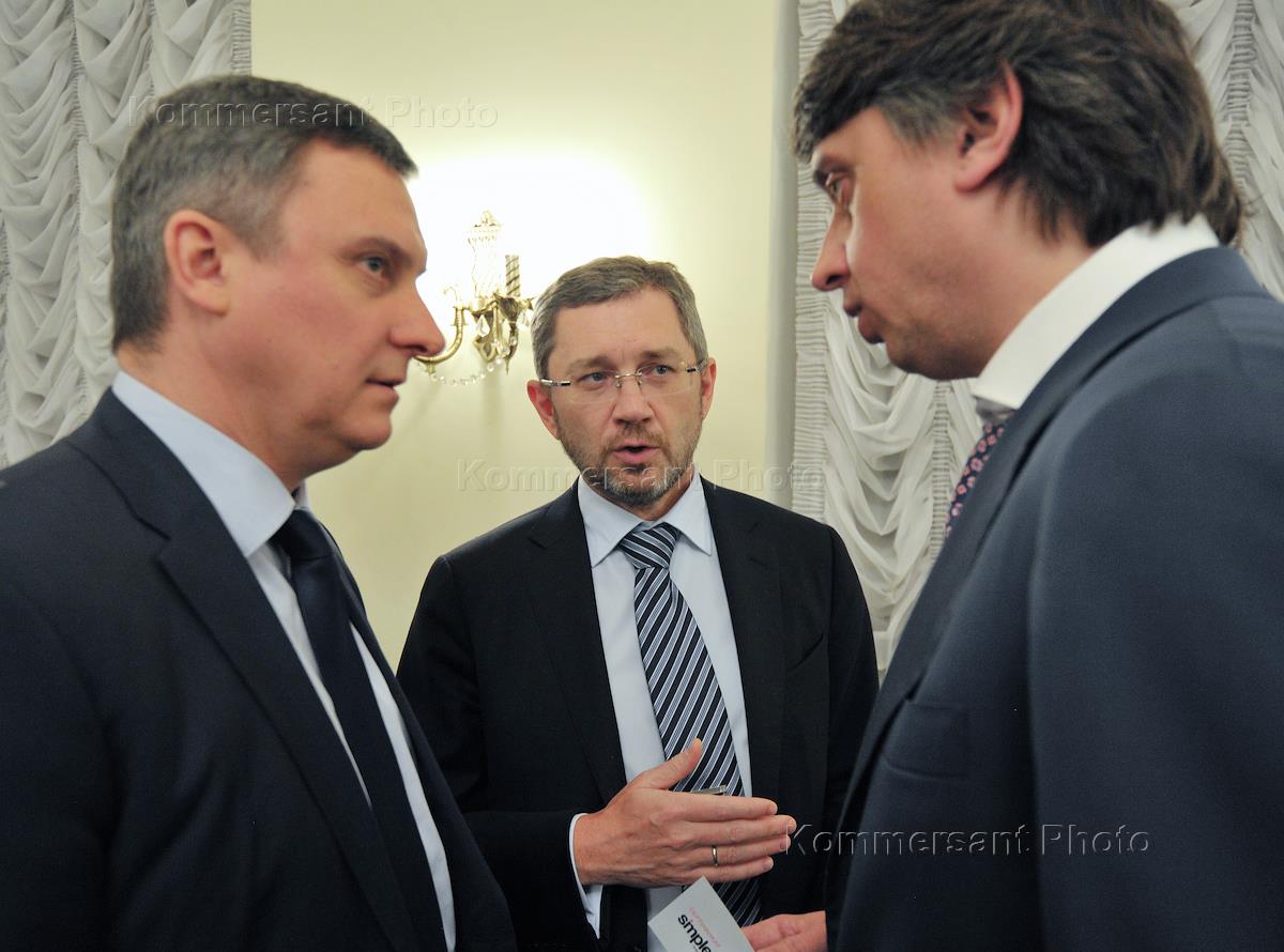 Руководитель Россвязи Олег Духовницкий (слева), председатель Правления АКБ "Инвестбанк" (ОАО) Константин Корищенко (в центре) и управляющий партнер АКБ "Инвестбанк" (ОАО), член Наблюдательного Совета Сергей Мастюгин (справа) на презентации книги бывшего председателя Центрального Банка России Виктора Геращенко в редакции радио "Коммерсантъ FM".