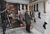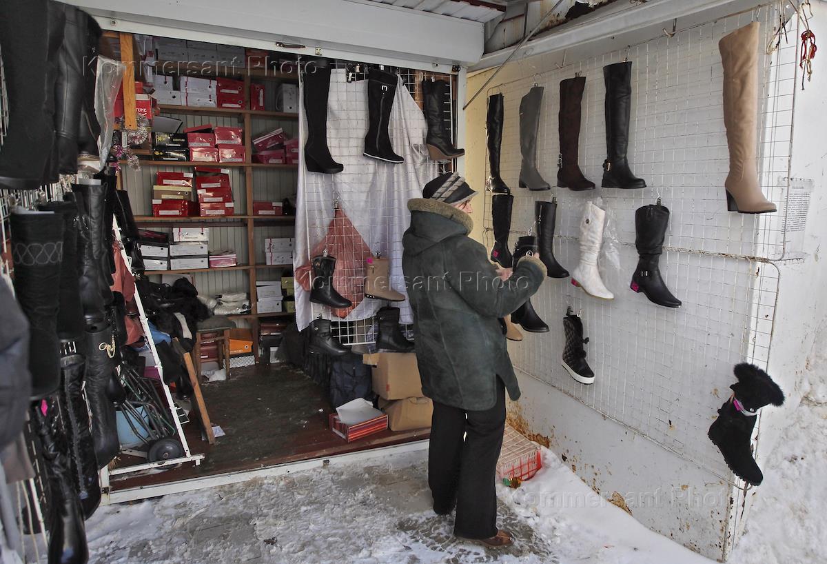 Вещевой рынок города. Покупатель в павильоне по торговле обувью.