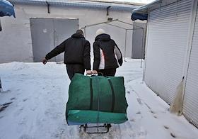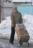 Вещевой рынок города. Продавцы везут тележку с товаром.
