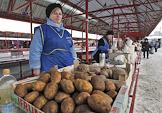 Продавцы в торговых рядах на колхозном рынке.