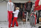 Вещевой рынок города. Девушка продавец в павильоне по торговле женской одеждой.
