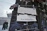 Вещевой рынок города. Павильон по торговле джинсами. Вывеска с надписью "Байкаю Распродажа".