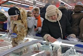 Покупатели в открывшемся супермаркете "Виталюр". Отдел замороженных продуктов.
