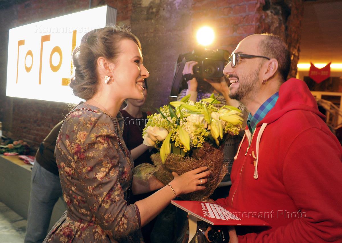 Продюсер Андрей Фомин (слева) и актриса, певица Альбина Джанабаева (в центре) на церемонии открытия "Гоголь-центра" режиссера Кирилла Серебренникова на базе московского драматического театра им. Гоголя.
