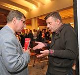 Художественный руководитель Театра "Сатирикон" имени А.Райкина Константин Райкин (слева) и специальный представитель президента России по международному культурному сотрудничеству Михаил Швыдкой (справа) на церемонии открытия "Гоголь-центра" режиссера Кирилла Серебренникова на базе московского драматического театра им. Гоголя.