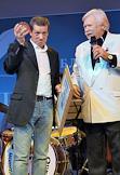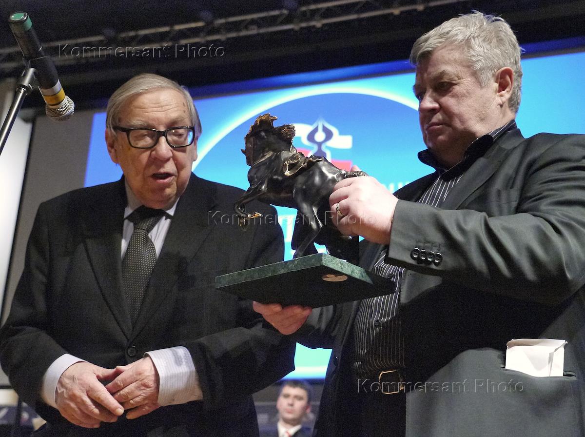 Благотворительный бал прессы прошел в Центре международной торговли. Фотограф Денис Вышинский (слева) и президент гильдии фотожурналистов Сергей Лидов (справа) во время церемонии награждения премией "Золотой глаз России".