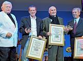 Благотворительный бал прессы прошел в Центре международной торговли. Фотографы Денис Вышинский (второй слева), Владимир Богданов (слева), Валерий Наседкин (справа) и президент Гильдии фотожурналистов Сергей Лидов (второй справа) во время церемонии награждения премией "Золотой глаз России".