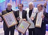 Благотворительный бал прессы прошел в Центре международной торговли. Фотограф Денис Вышинский (в центре) и президент Гильдии фотожурналистов Сергей Лидов (второй справа) во время церемонии награждения премией "Золотой глаз России".