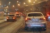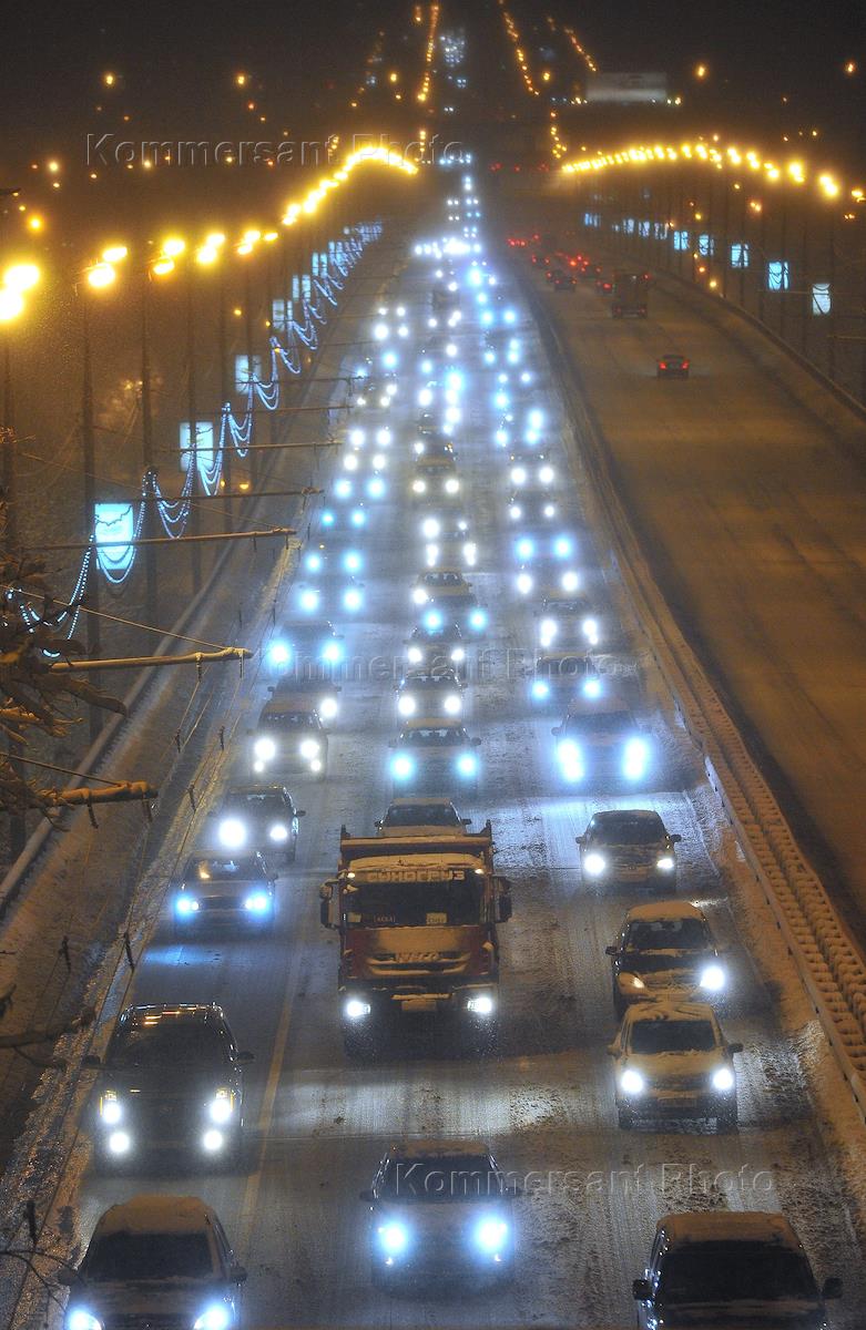 Сильный снегопад в Москве. Плотный поток автомобилей на улицах города.